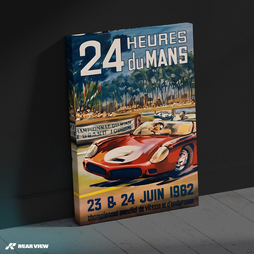 انغمس في حماس سباق لومان ٢٤ ساعة لعام ١٩٦٢ مع هذه المطبوعة الفنية الرائعة. تُظهر هذه اللوحة سيارة سباق حمراء أسطورية تشق طريقها عبر الحلبة الشهيرة، محاطة بمناظر طبيعية خلابة وجماهير متحمسة، لتجسّد قمة سباقات التحمل. إضافة مثالية لأي منزل أو مكتب، أو هدية مميزة لعشاق السباقات.