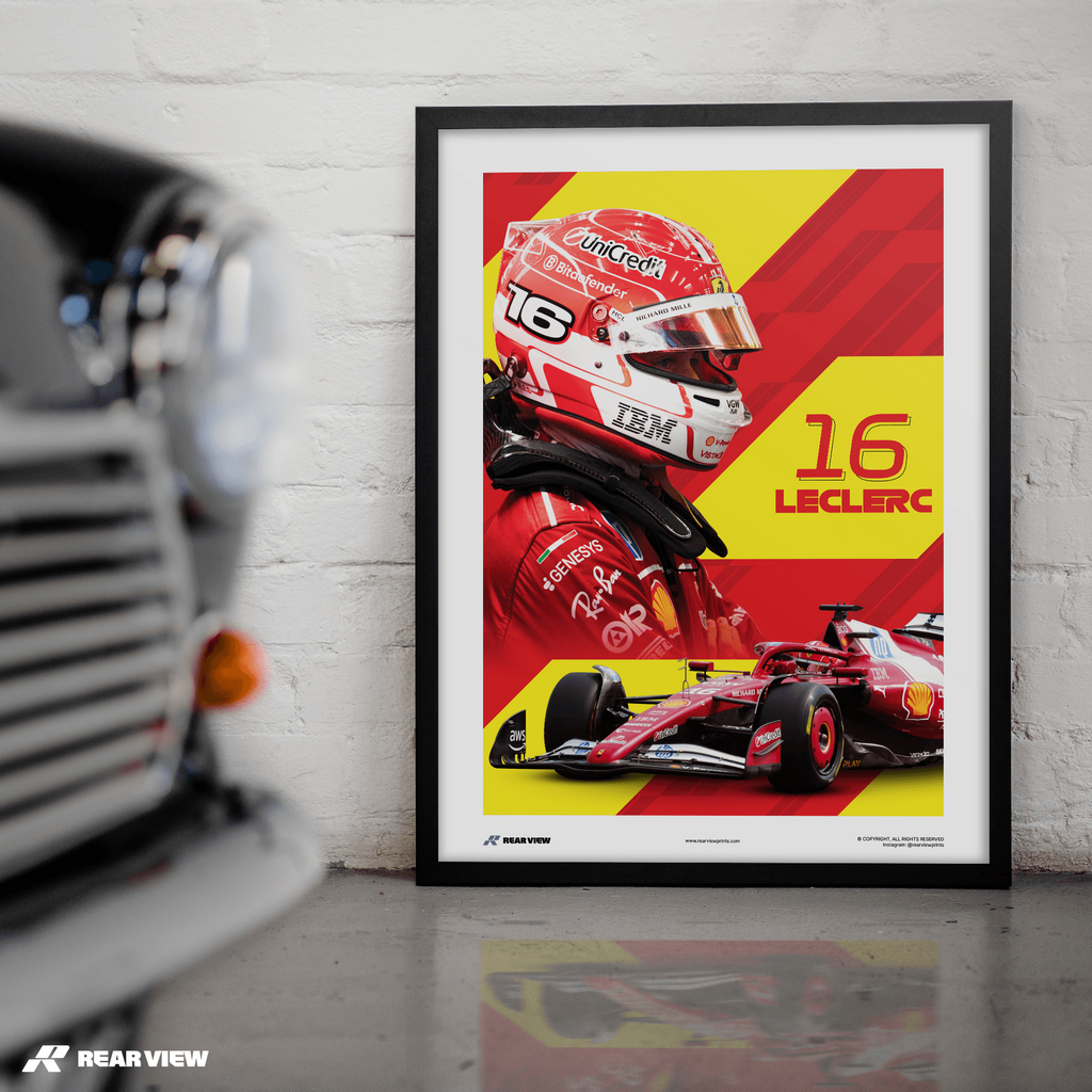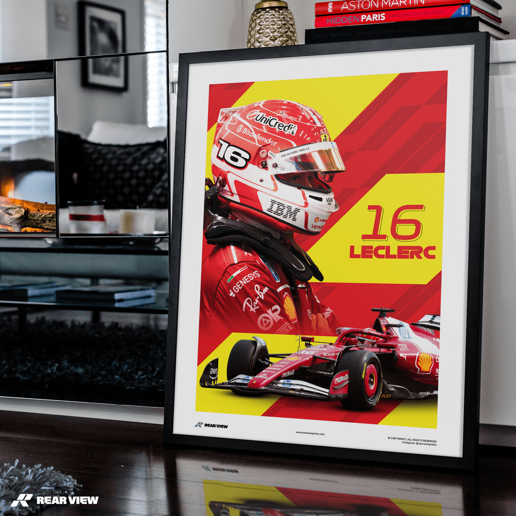 Bold red meets pure precision in this tribute to one of F1’s fiercest competitors. A striking blend of helmet, machine and momentum, this print is made to stand out.