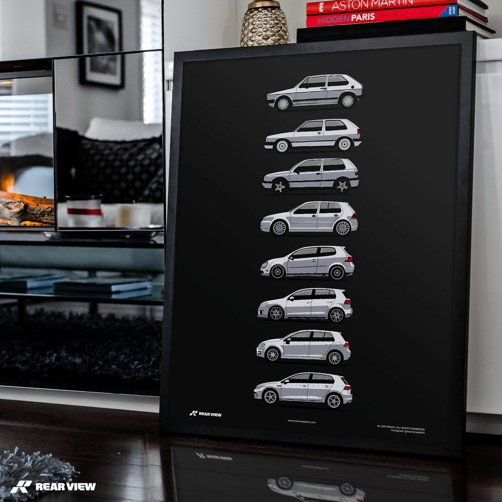 Every shape tells a story—Fast Lane Roots lines up the legendary hot hatch through the decades, from sharp-edged rebel to refined road rocket. This side-profile artwork captures the essence of speed and attitude that made the GTI a favourite across generations.
