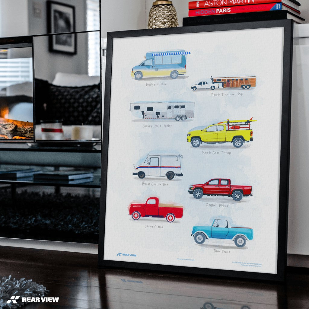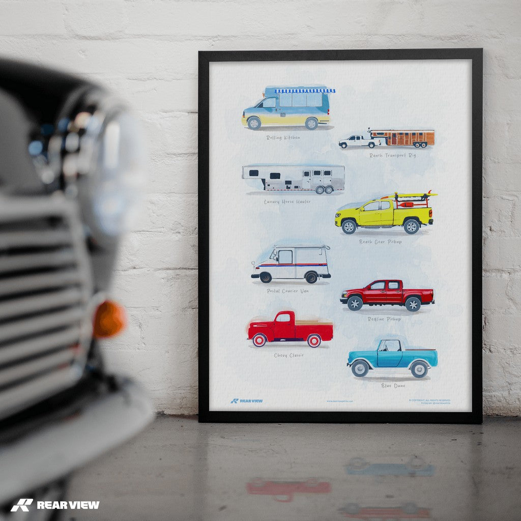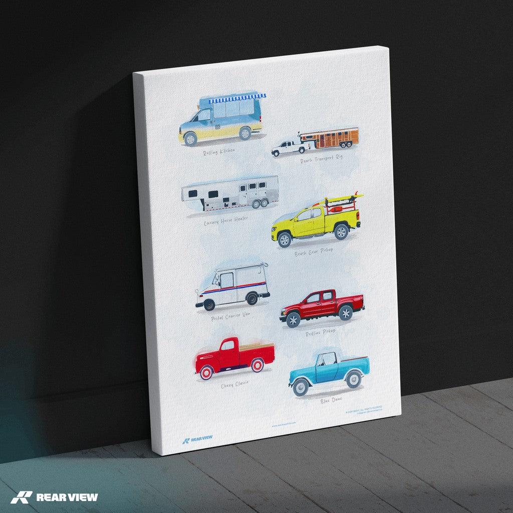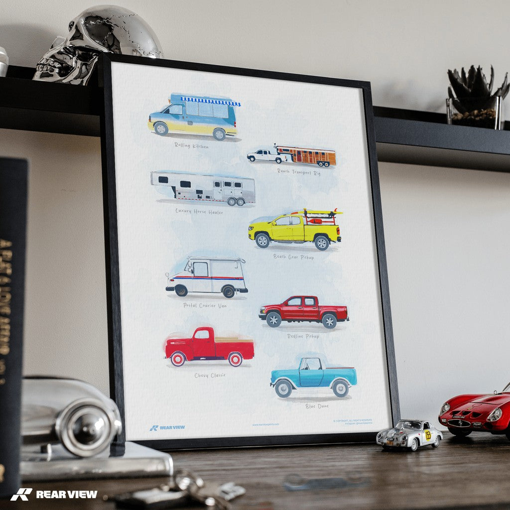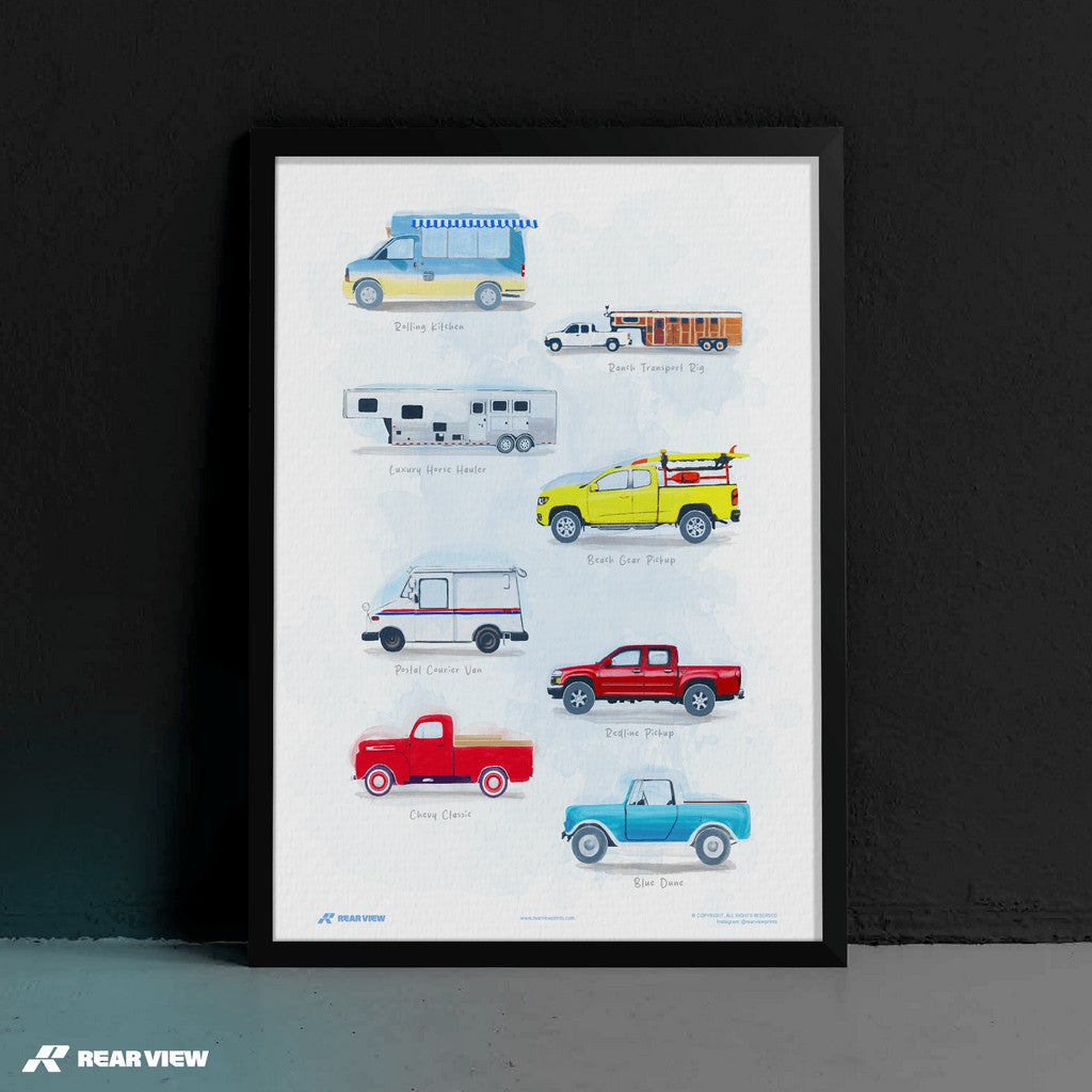 Haul Stars brings together a proud lineup of pickups and vans with purpose, from postal rigs and beach haulers to food trucks and horsepower movers. Hand painted by one of our artists, it oozes utility with flair, celebrating the style of working vehicles that get things done without losing cool.