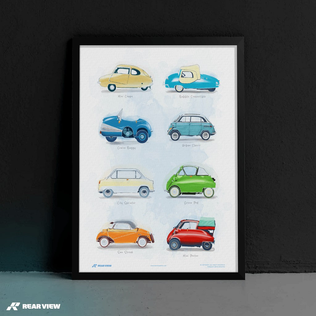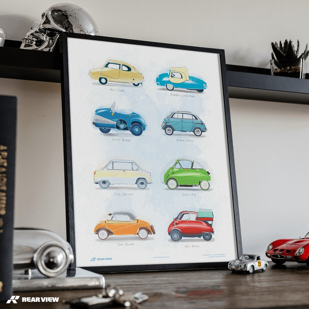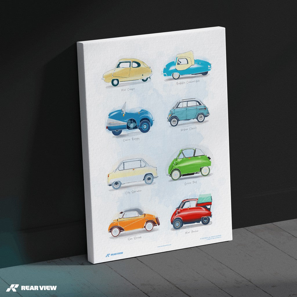 Small Legends is a tribute to the pint-sized champs of the street: zippy coupes, quirky convertibles, and clever buggies that pack more character than cars twice their size. Hand painted by one of our artists, a fun, colourful lineup perfect for brightening a wall, sparking memories of first drives.