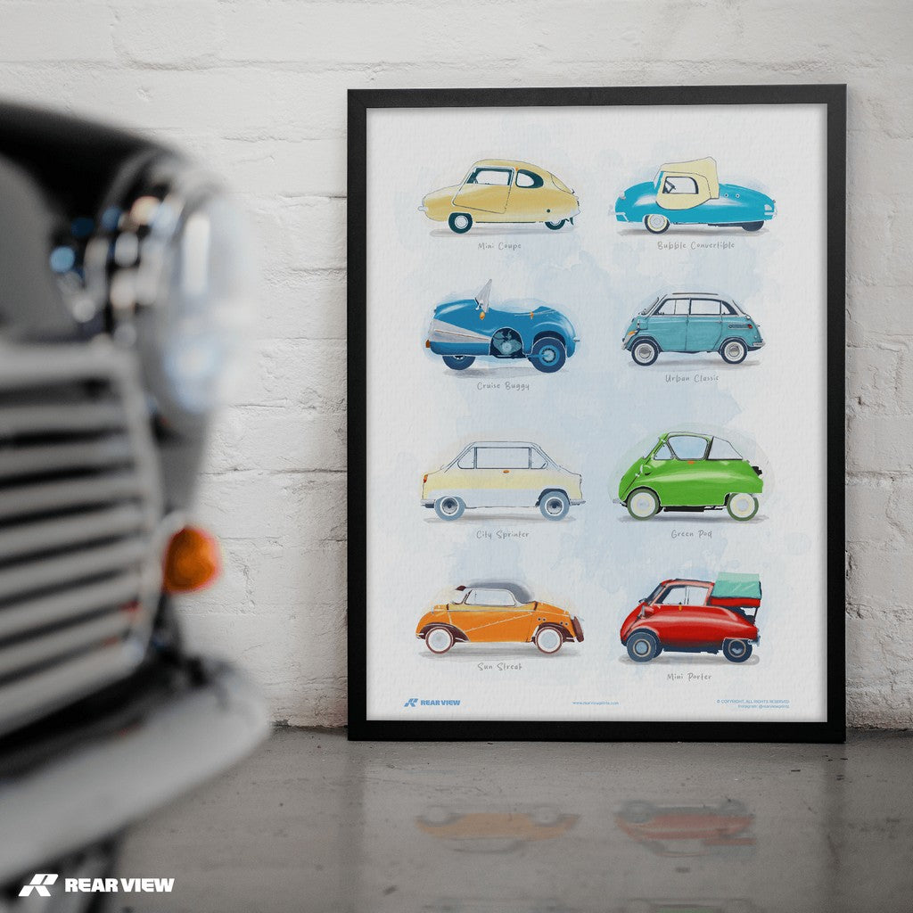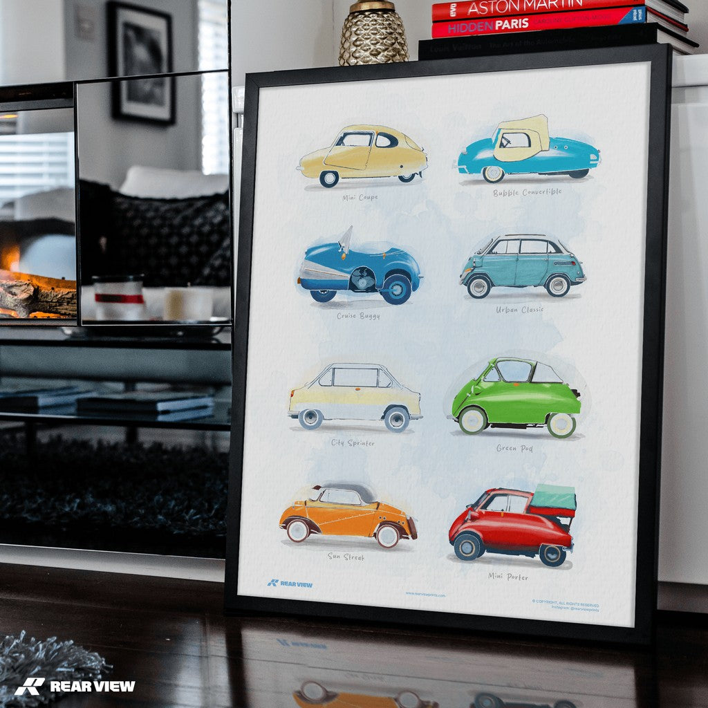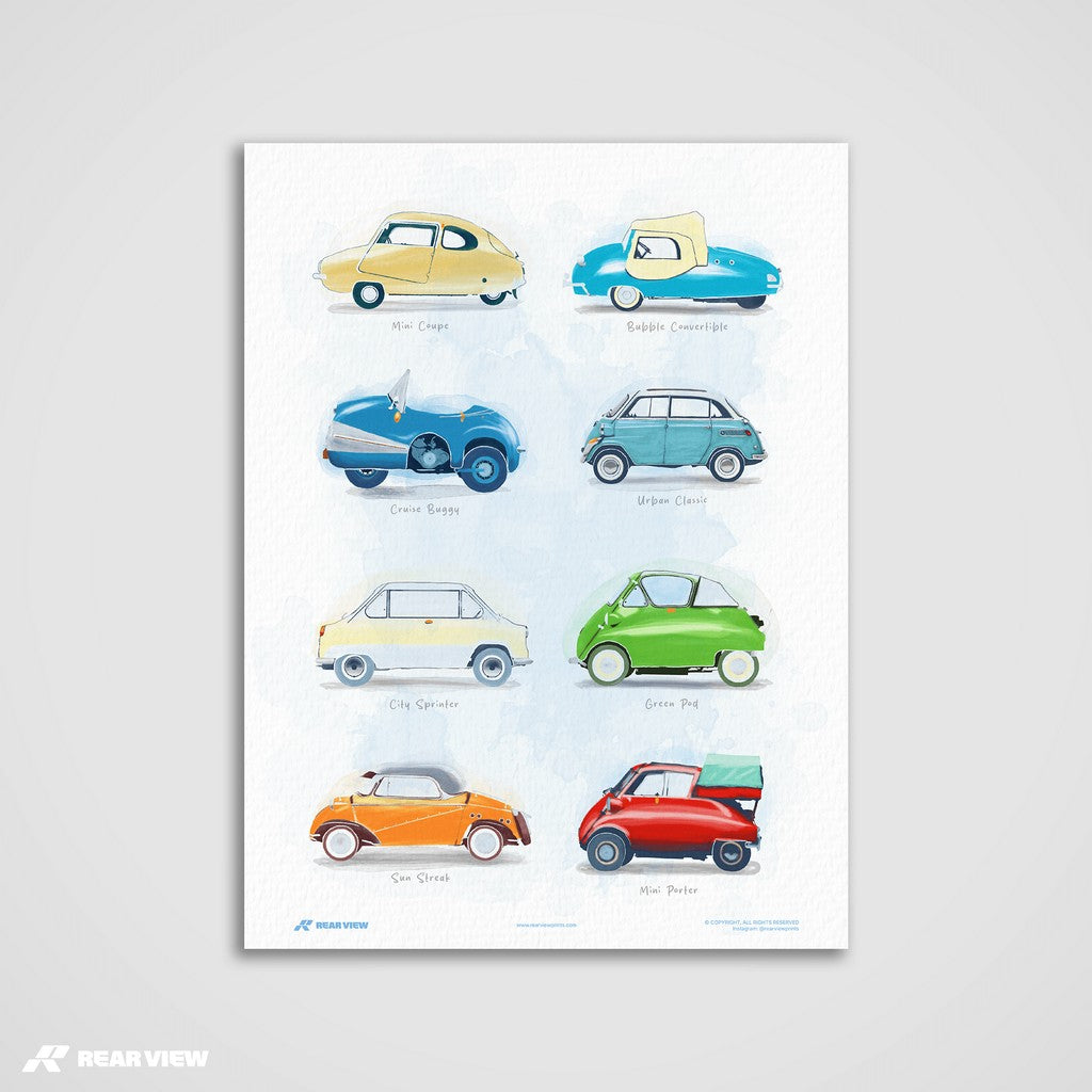 Small Legends is a tribute to the pint-sized champs of the street: zippy coupes, quirky convertibles, and clever buggies that pack more character than cars twice their size. Hand painted by one of our artists, a fun, colourful lineup perfect for brightening a wall, sparking memories of first drives.