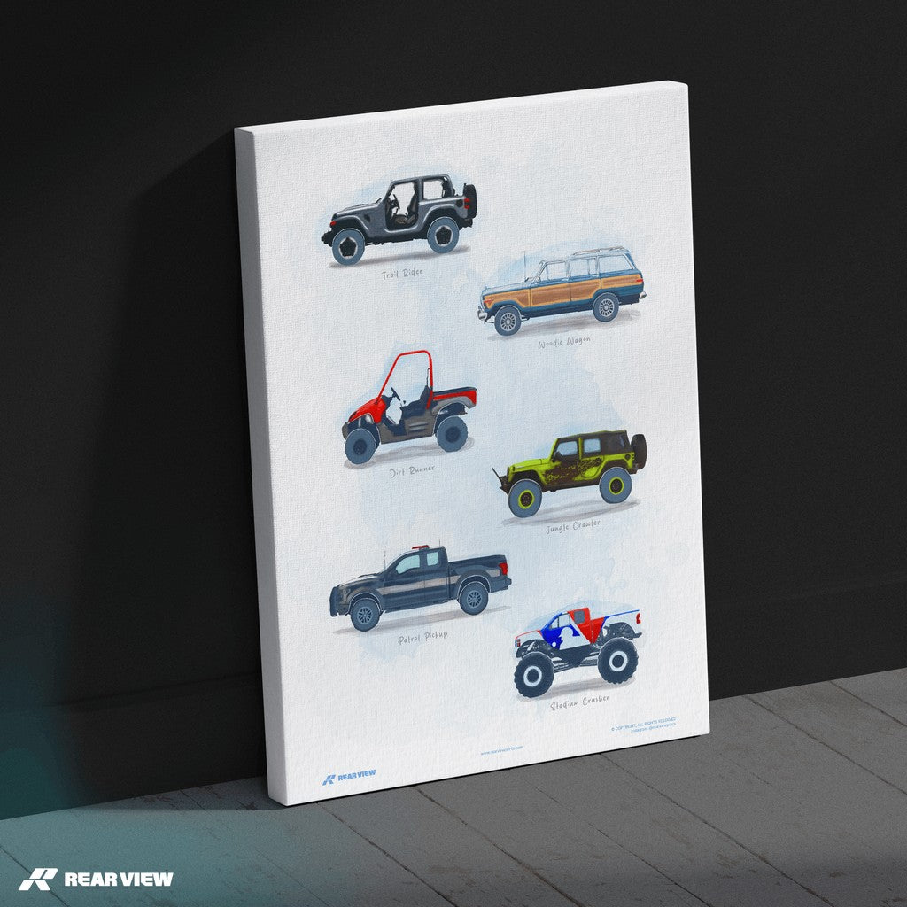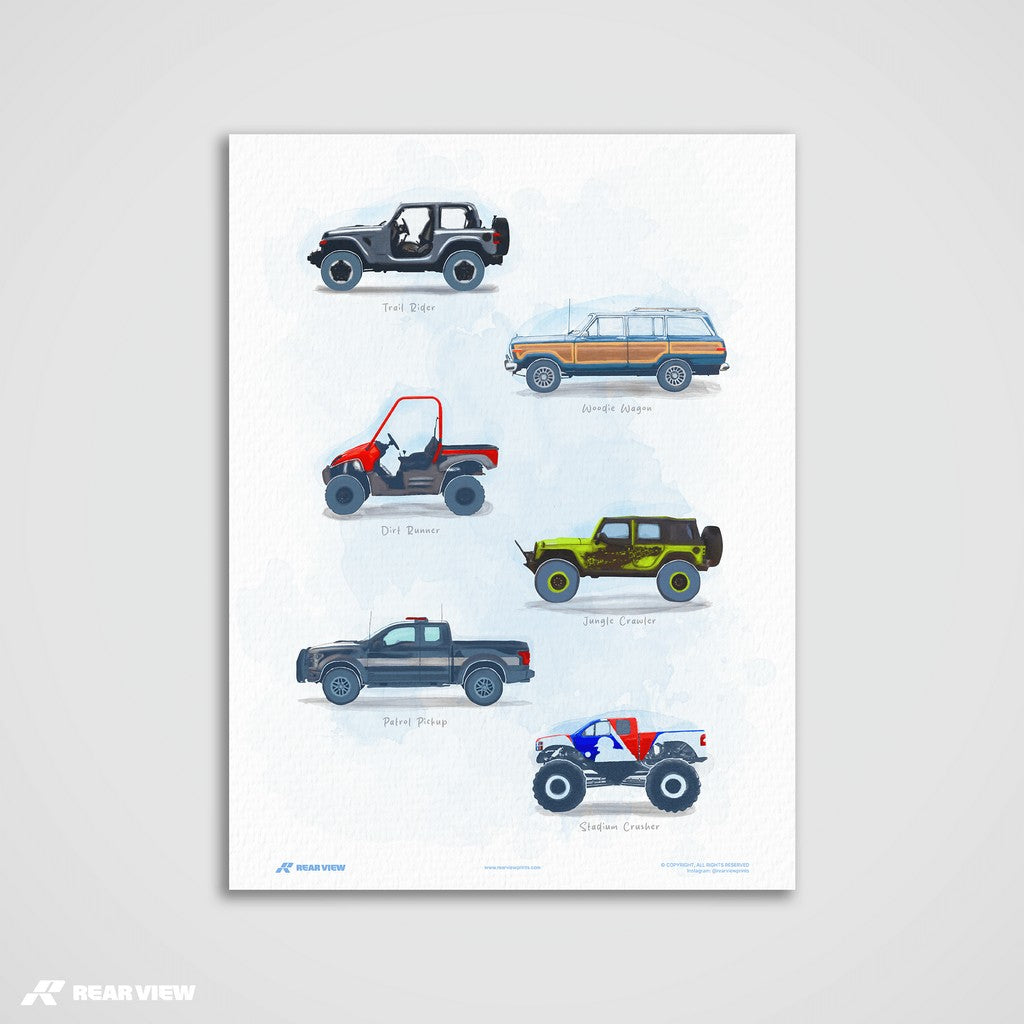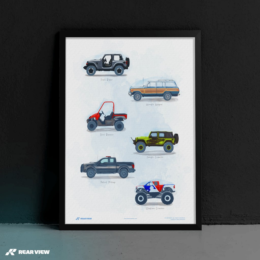 Wild Terrain captures the untamed spirit of off-road machines, from jungle-crawling beasts to beach-bound wagons and full-throttle monster trucks. Hand painted by one of our artists, this poster’s a love letter to grit, mud, and raw traction.