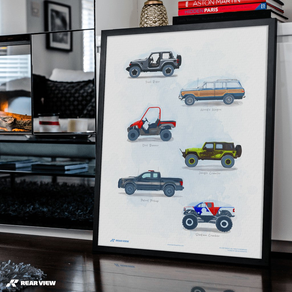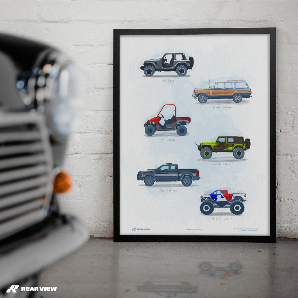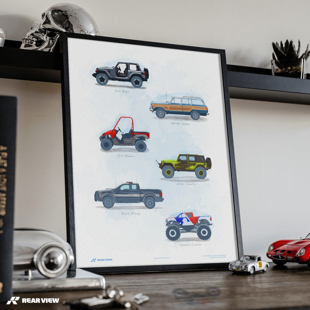 Wild Terrain captures the untamed spirit of off-road machines, from jungle-crawling beasts to beach-bound wagons and full-throttle monster trucks. Hand painted by one of our artists, this poster’s a love letter to grit, mud, and raw traction.