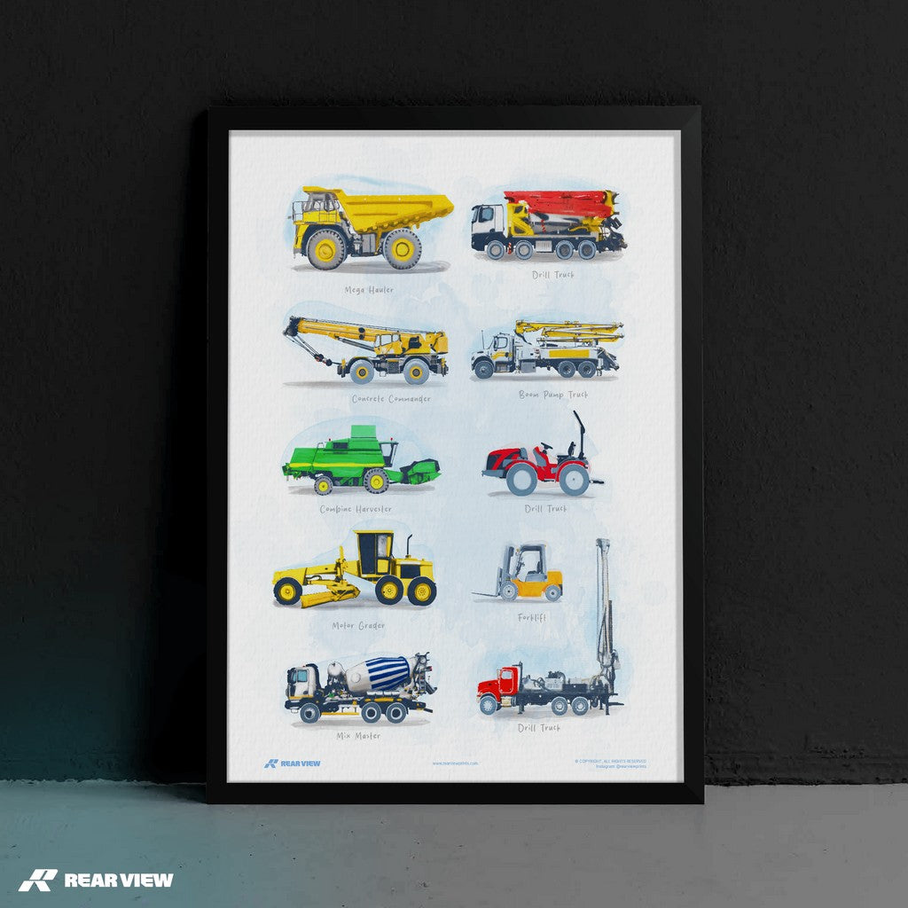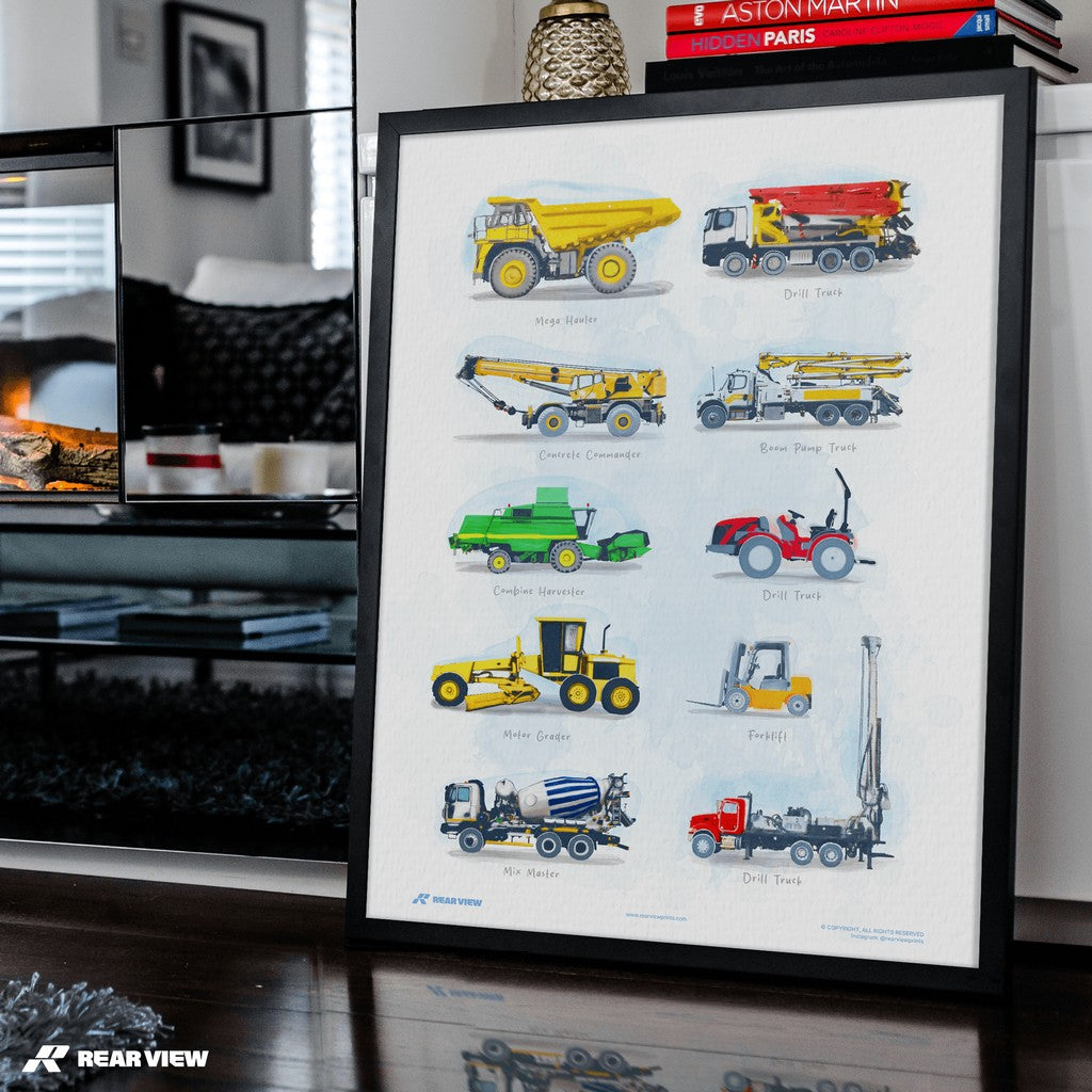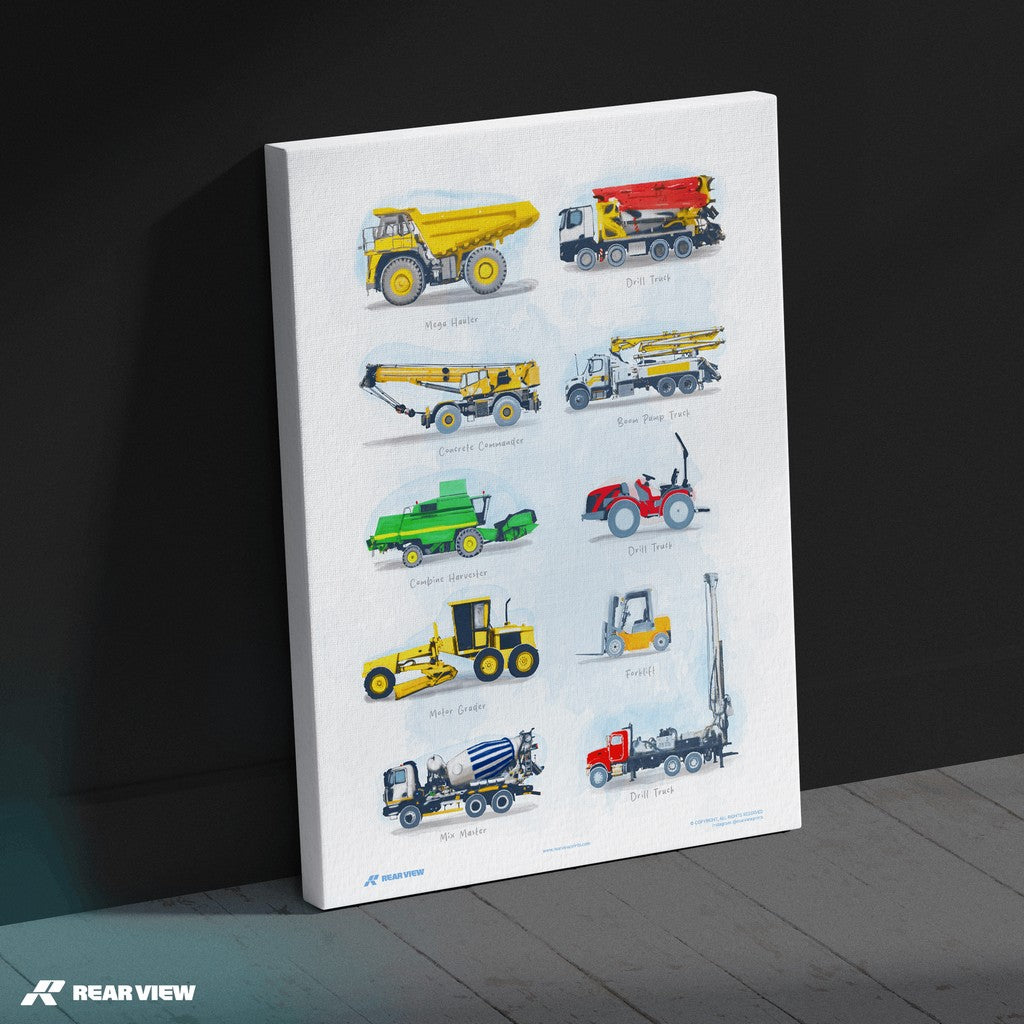 Worksite Titans lines up the real heroes of the heavy-duty world—from concrete beasts to mega haulers and field kings. This hand painted print captures the muscle and purpose of machines that never take a day off.