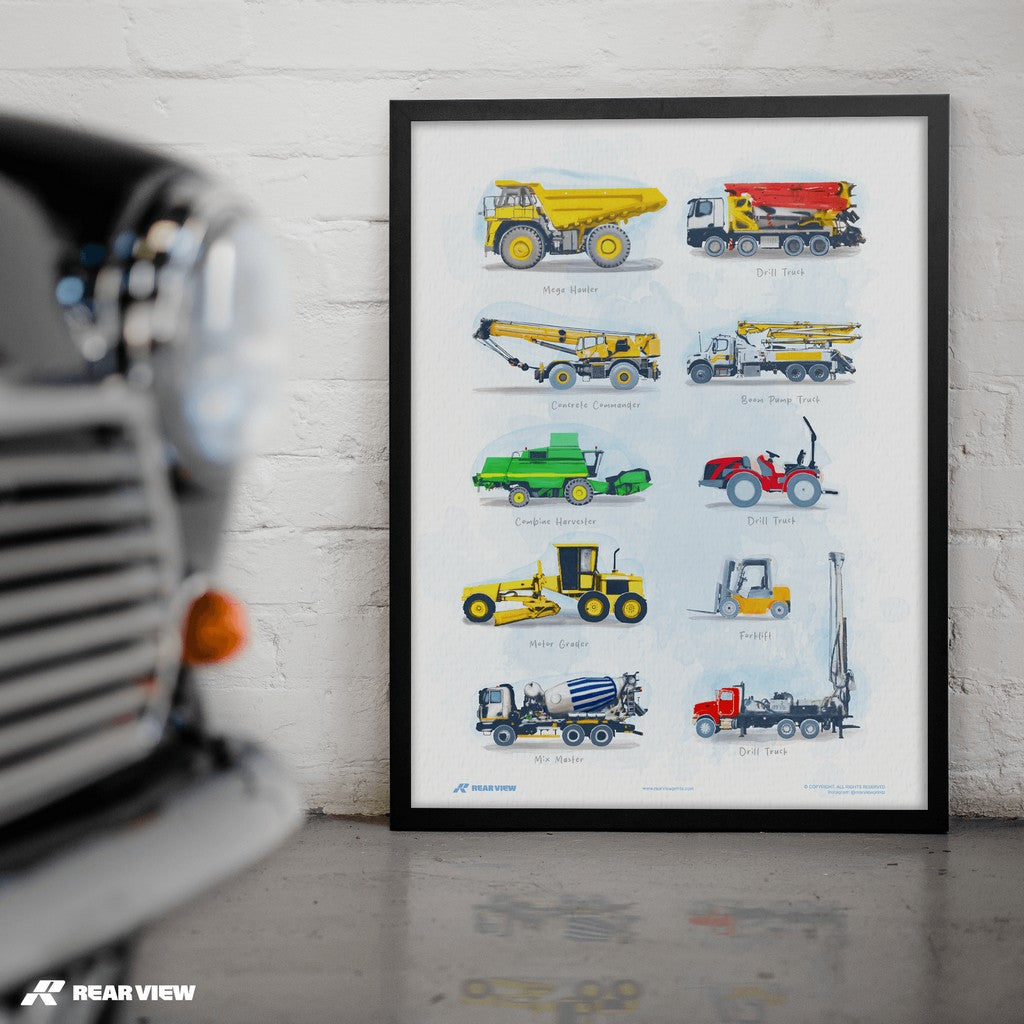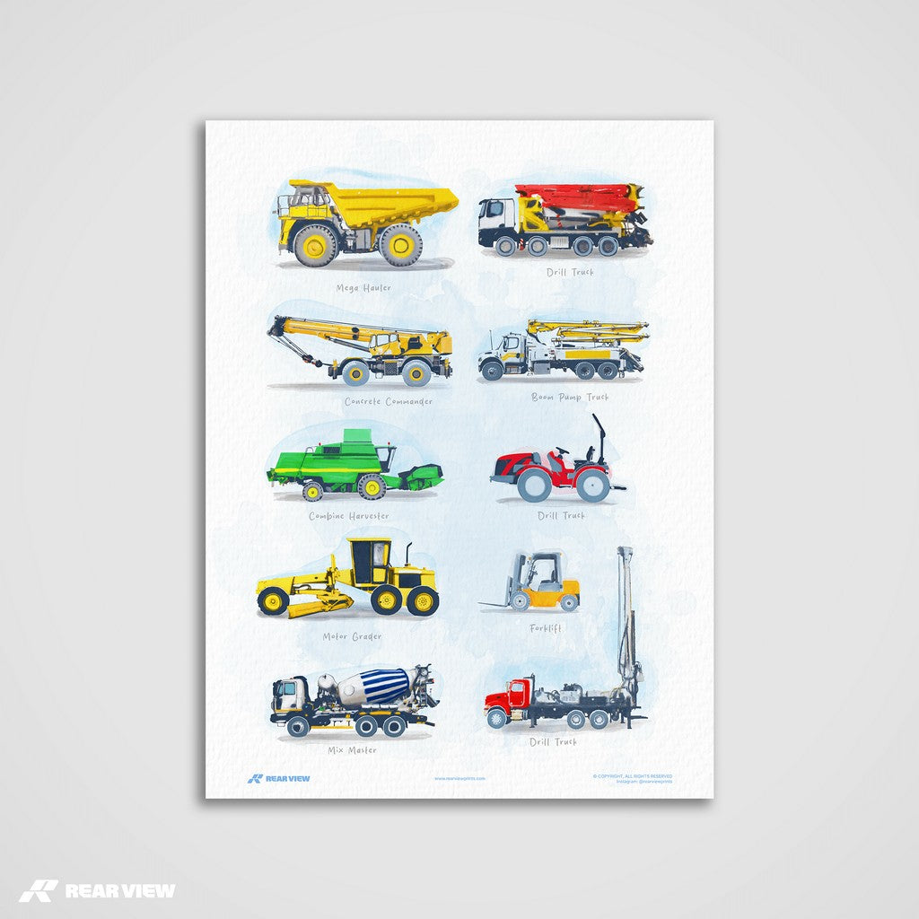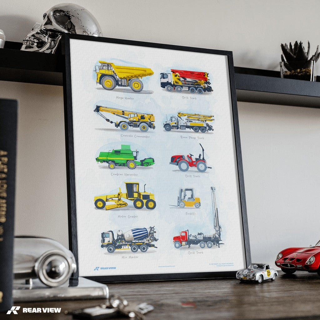 Worksite Titans lines up the real heroes of the heavy-duty world—from concrete beasts to mega haulers and field kings. This hand painted print captures the muscle and purpose of machines that never take a day off.