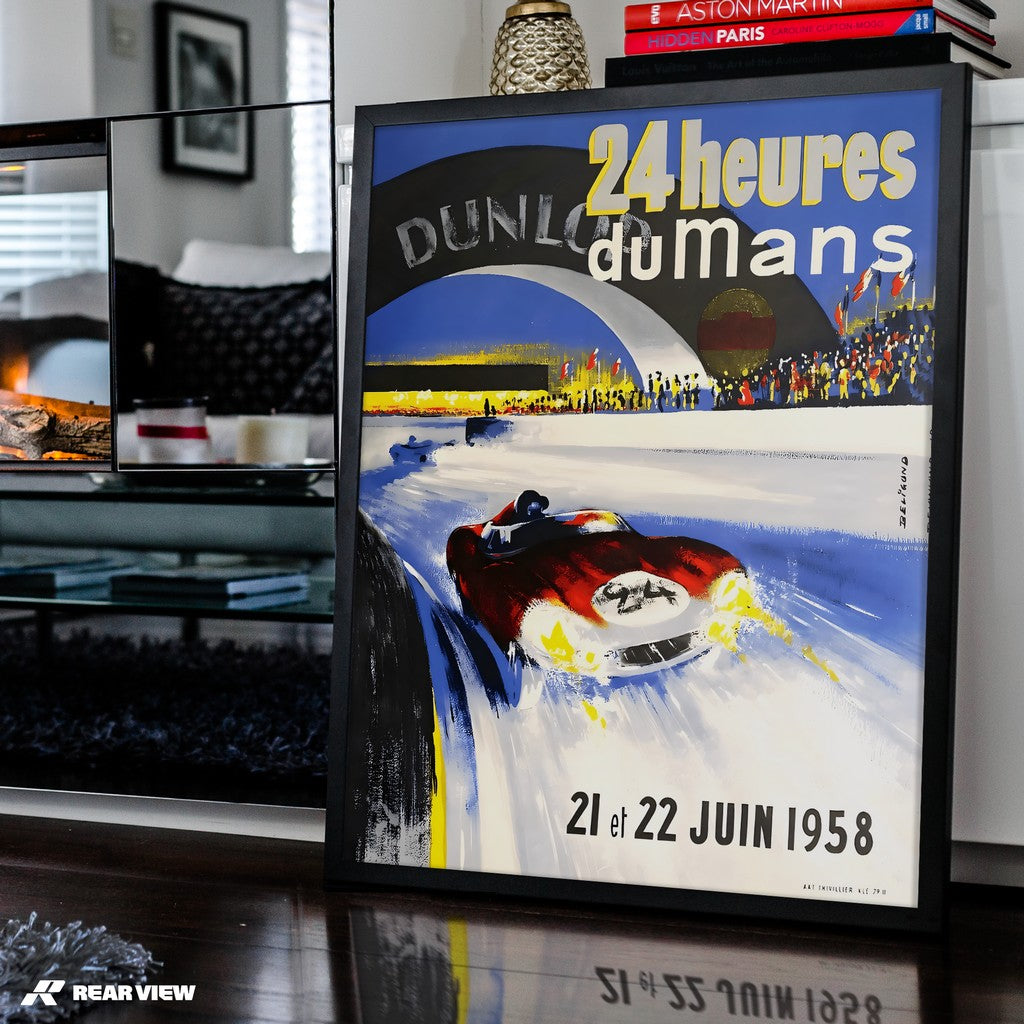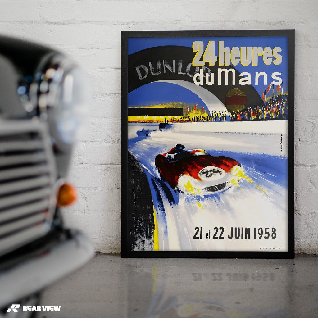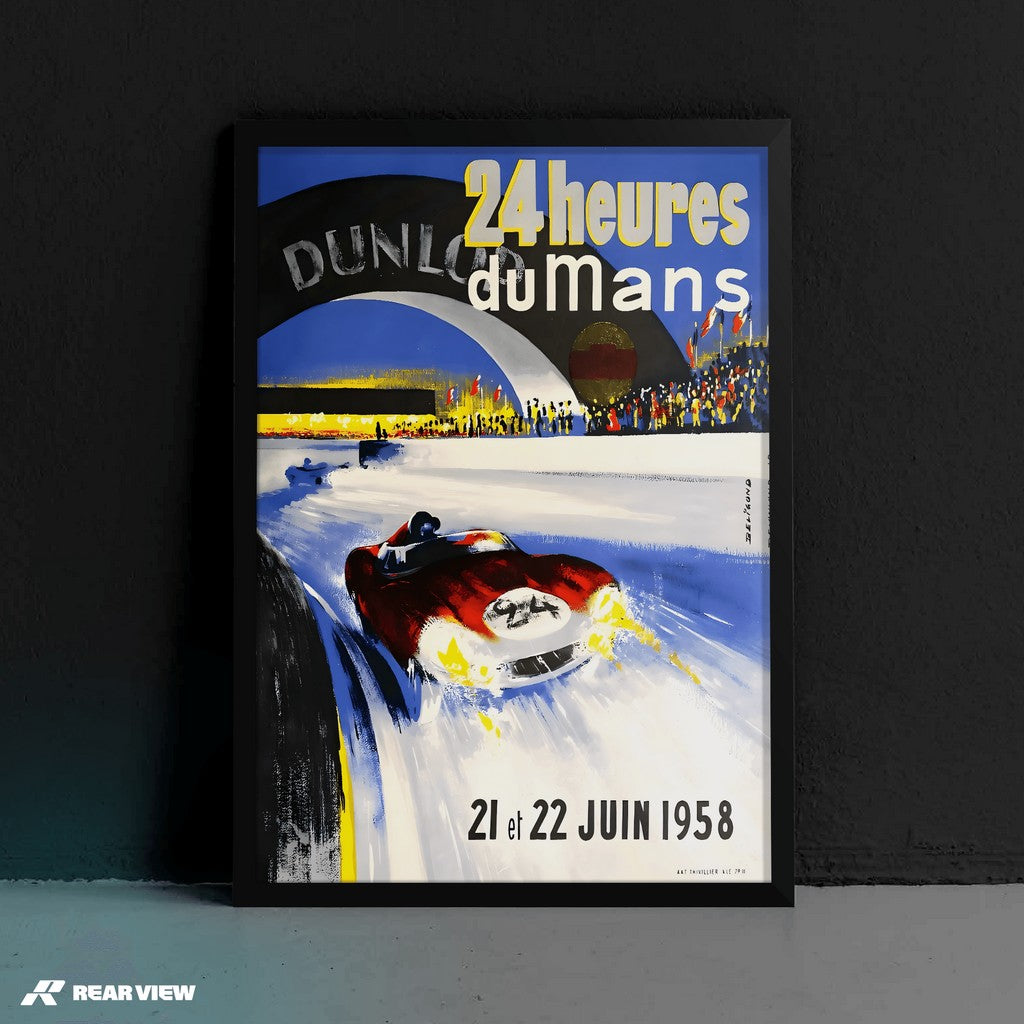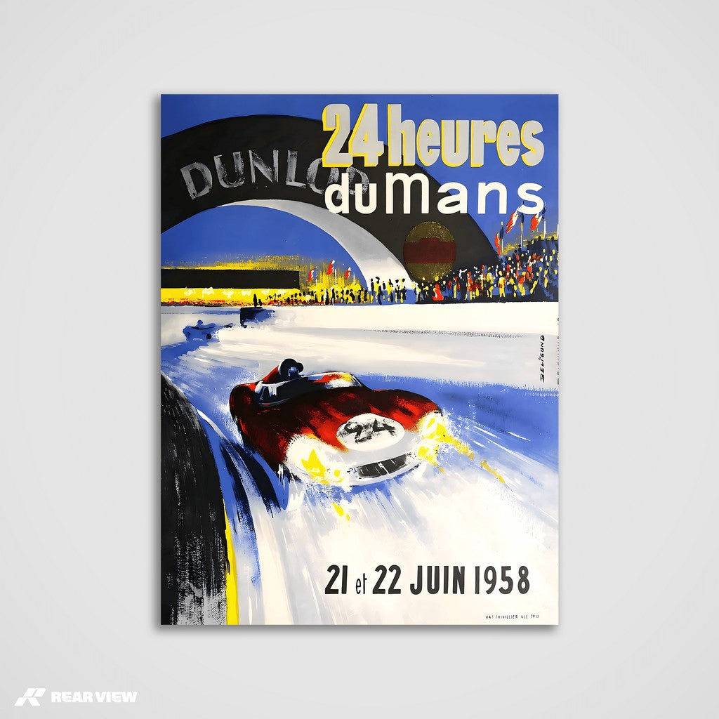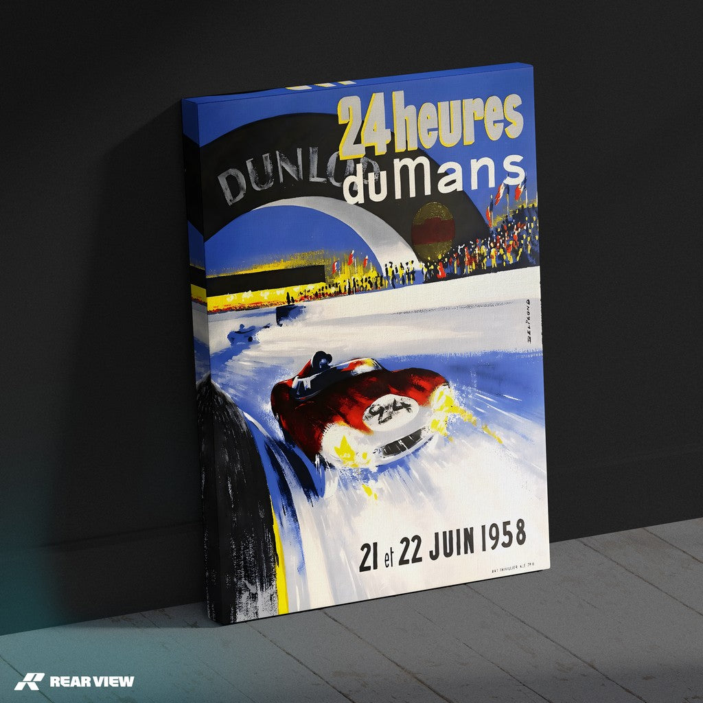 Dive into the excitement of the 1958 24 Hours of Le Mans with this electrifying art print. Featuring a bold red racer blazing under the iconic Dunlop Bridge, this piece captures the intensity and spectacle of endurance racing. Perfect for Motorsport fans to showcase in their home or office, or as a unique gift for a racing enthusiast.