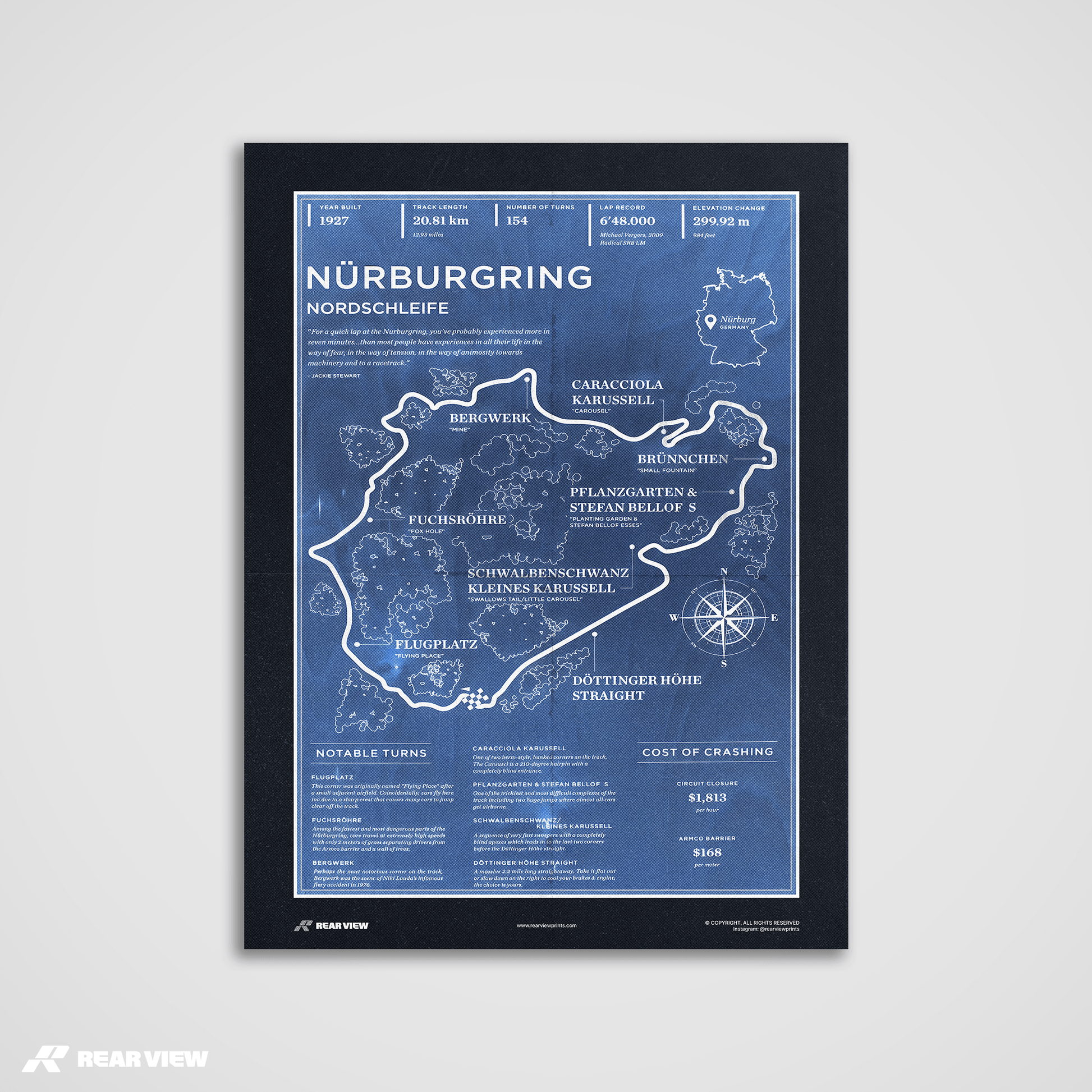 Whether as a treat for yourself or a thoughtful gift for a fellow car racing enthusiast, Germany's Nurburgring Race Track vintage art print is sure to impress.