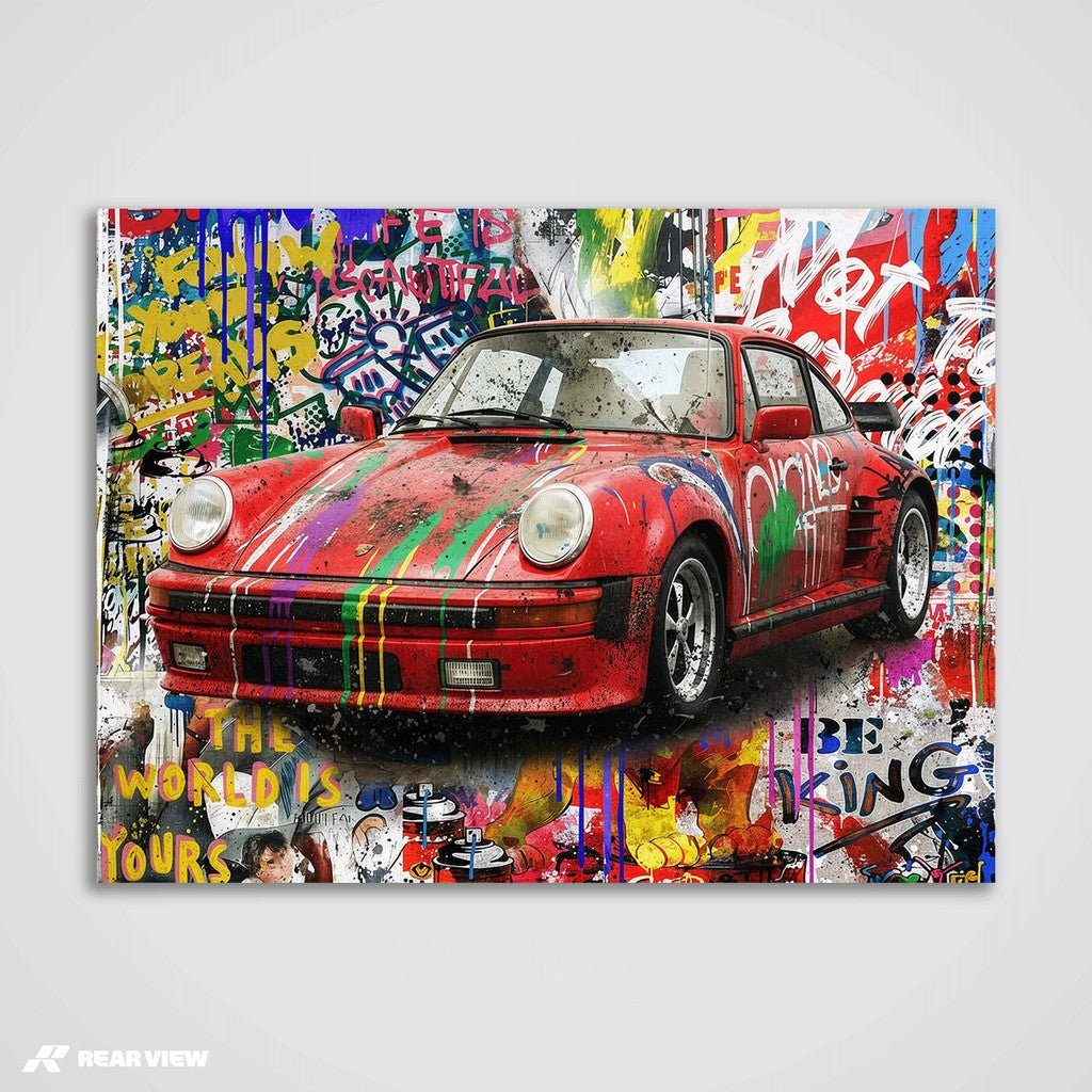 A red 911 drenched in paint splashes and graffiti energy, blending raw motion with street attitude.