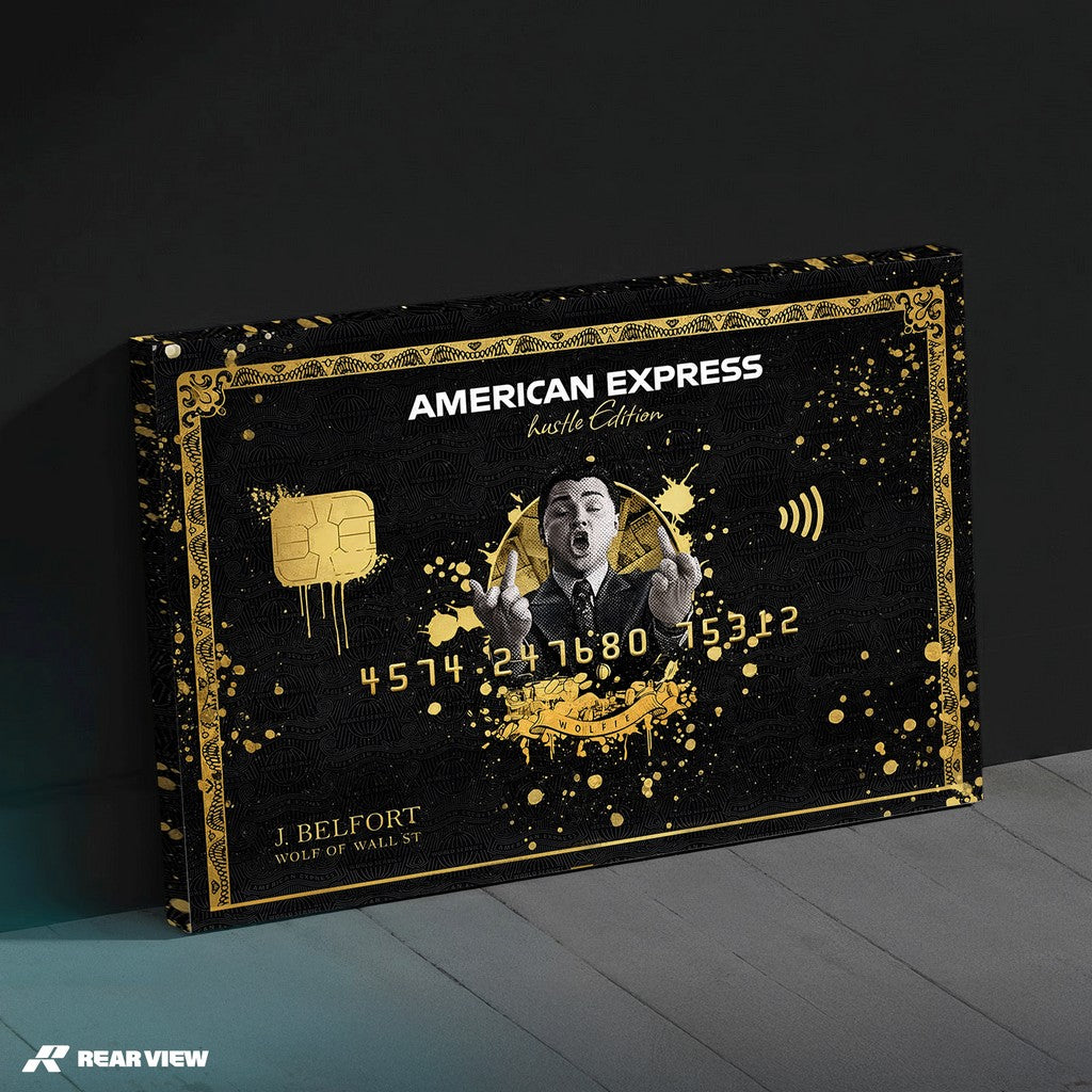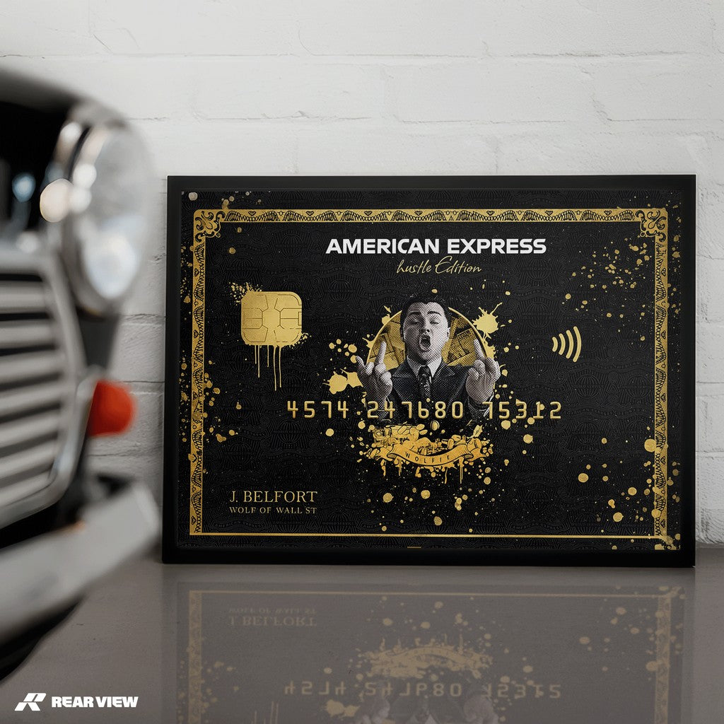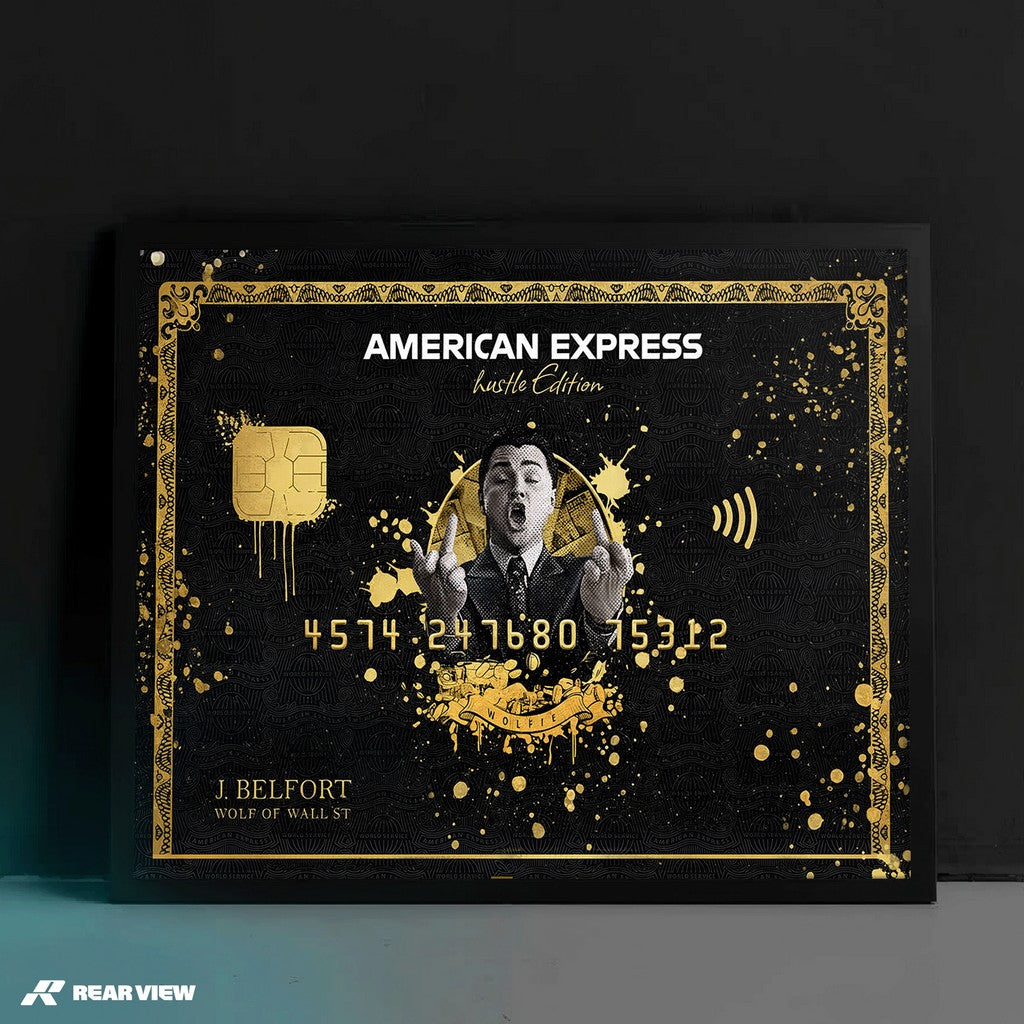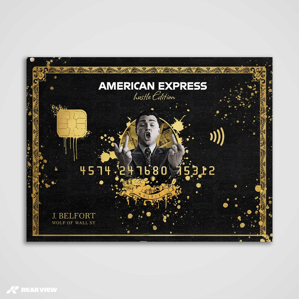 This striking design merges premium black card aesthetics with rebellious gold graffiti art, centered around cinema's most notorious stockbroker. The bold gesture embodies the excess and audacity that defined an era of market mayhem.