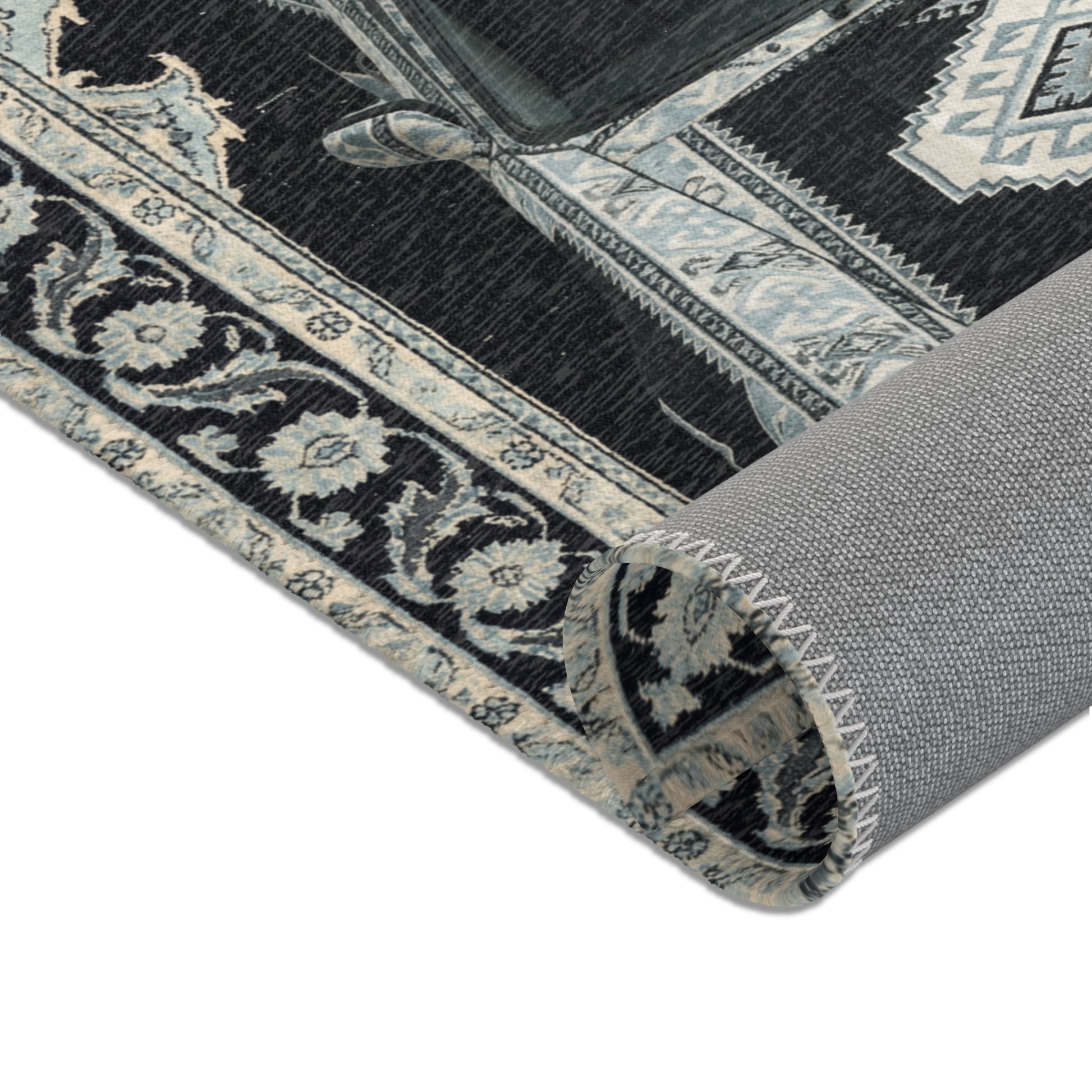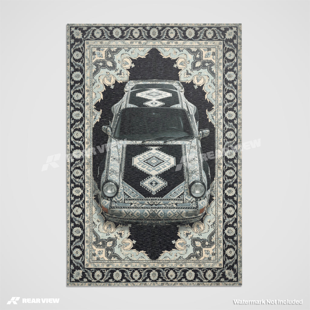 A top-down 911 Turbo set into a cool-toned Persian medallion layout, finished in soft greys, faded blues, and dark charcoal. The clean symmetry and muted palette echo the car’s balance and understated speed.