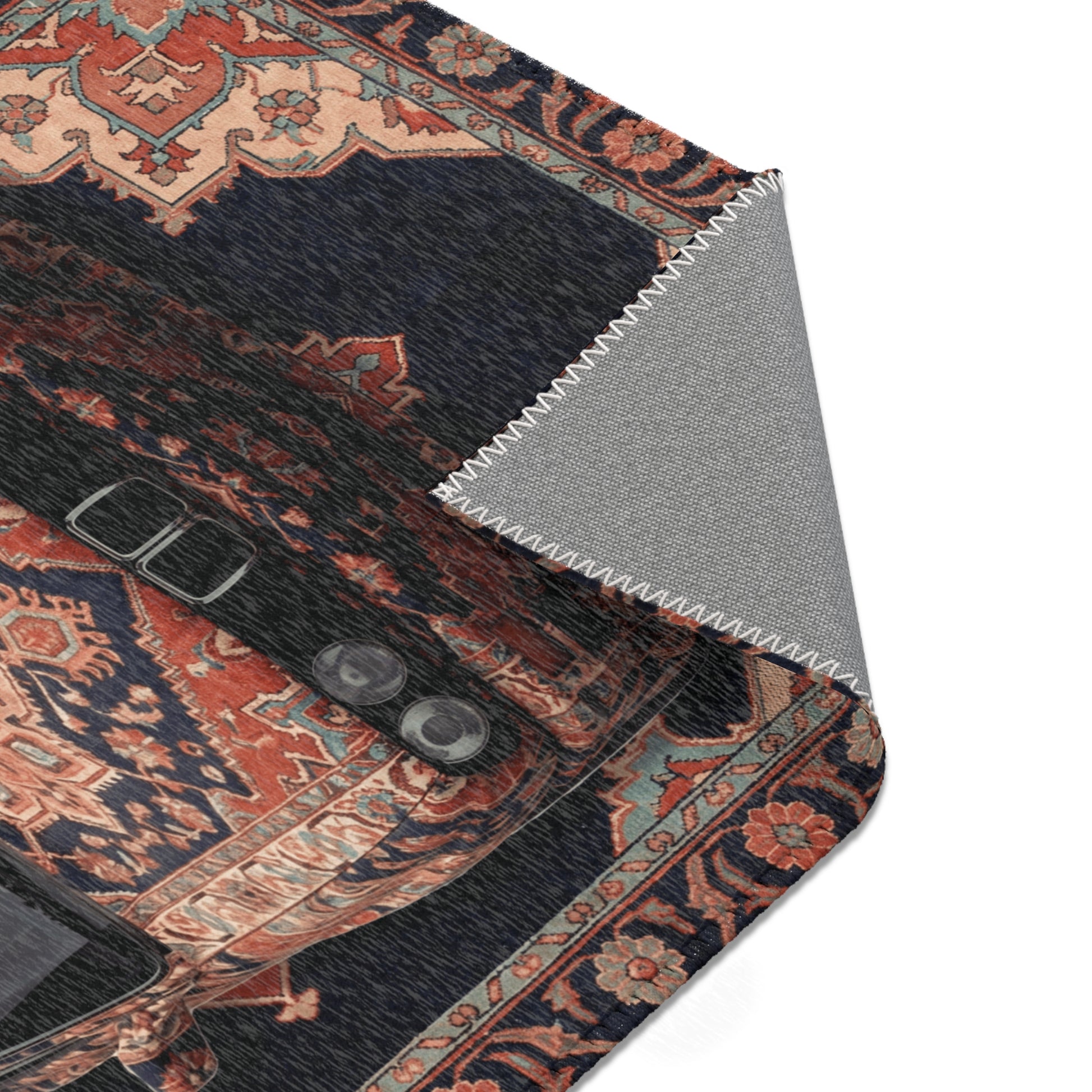 A top-down M3 E30 set into a deep Persian medallion pattern, finished in warm reds, muted blues, and aged stone tones. The layout mirrors the car’s boxy stance and racing roots, giving the piece balance and quiet authority.