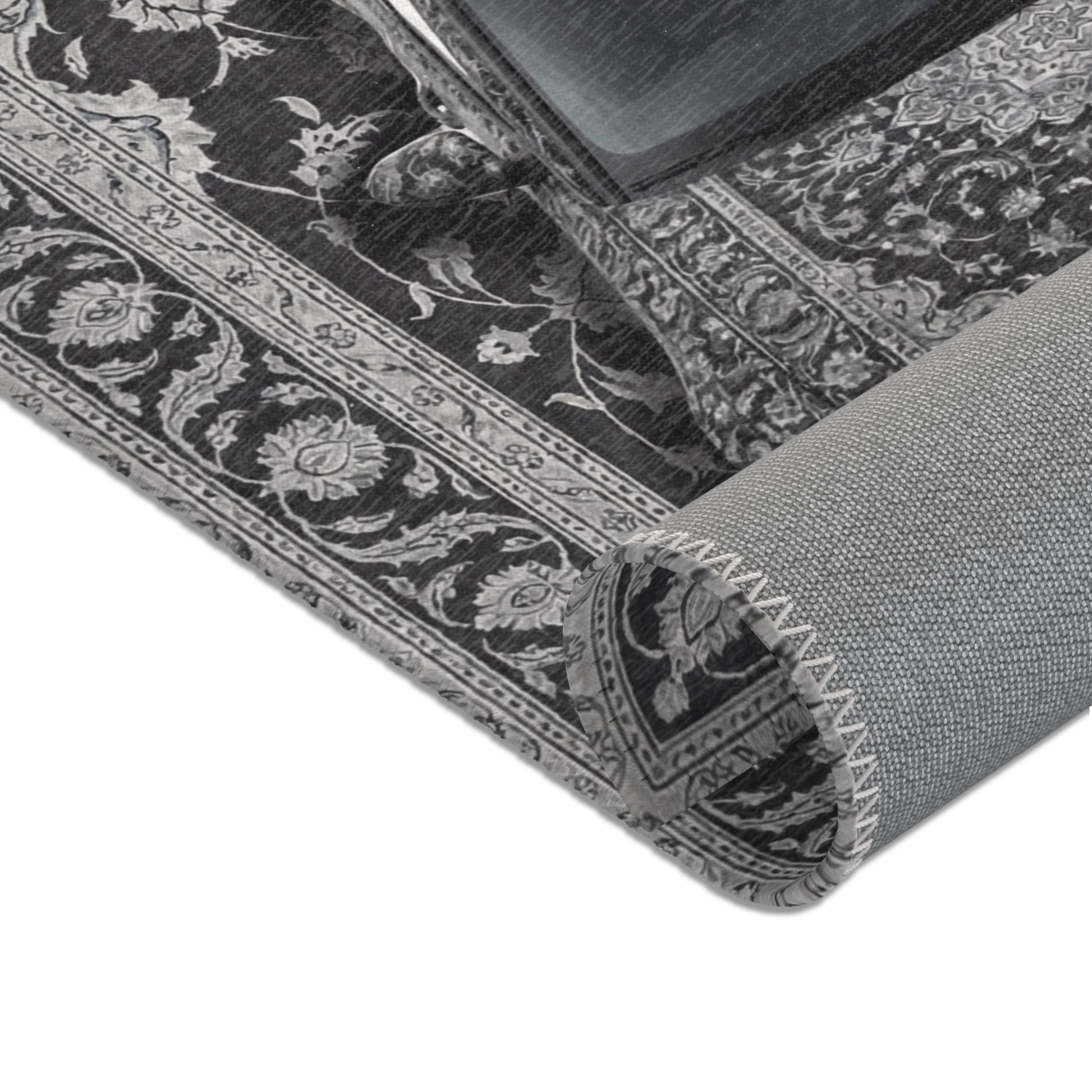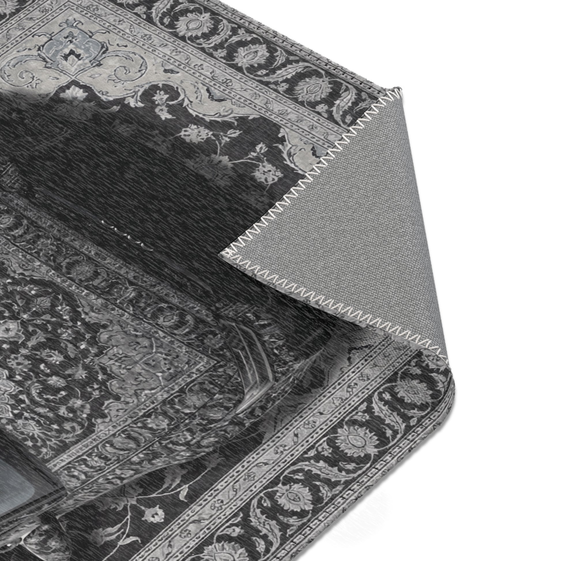 Printed on a soft chenille-style textile with a matte woven finish, this rug is made to lay flat and live easily in offices, studios, garages, and modern interiors.