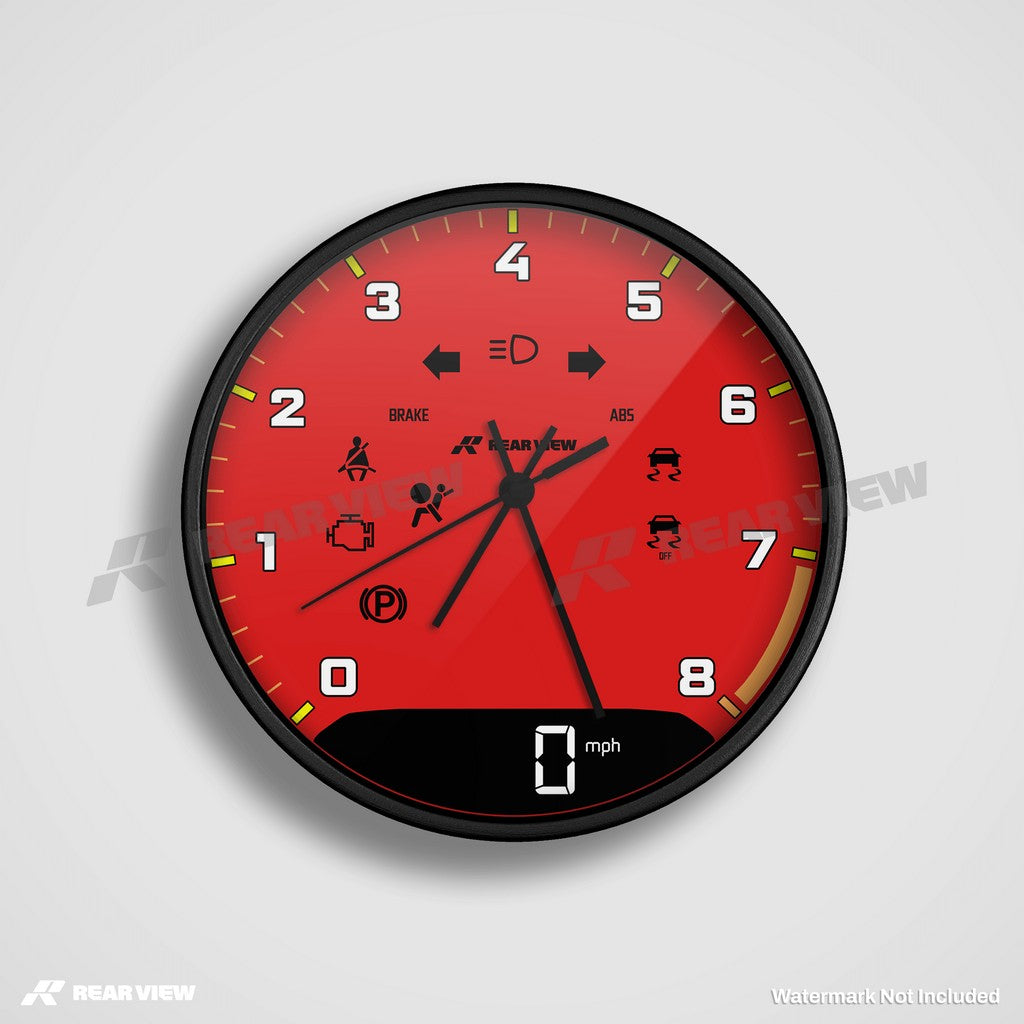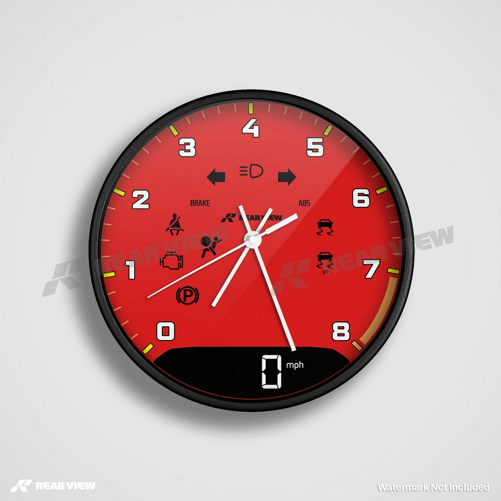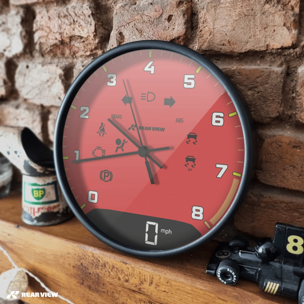 Note: This is a motorsport-inspired decorative clock and not a real vehicle speed dial or instrument. It does not contain mechanical components, instruments, or working vehicle gauges of any kind.
