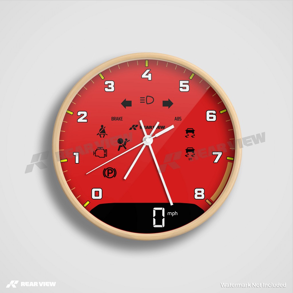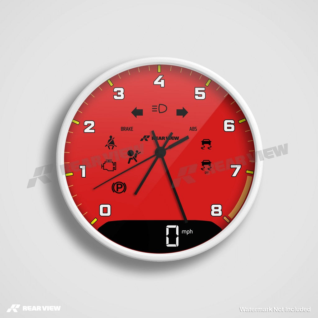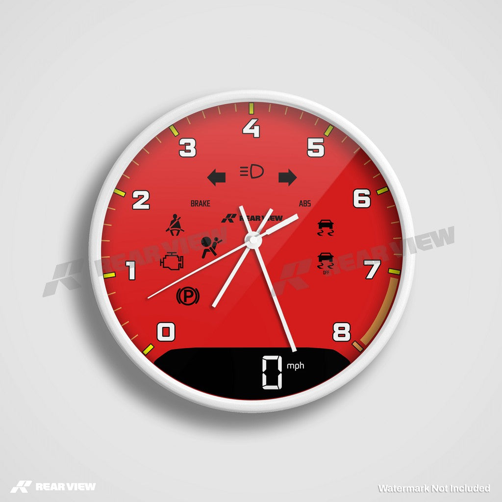 Note: This is a motorsport-inspired decorative clock and not a real vehicle speed dial or instrument. It does not contain mechanical components, instruments, or working vehicle gauges of any kind.