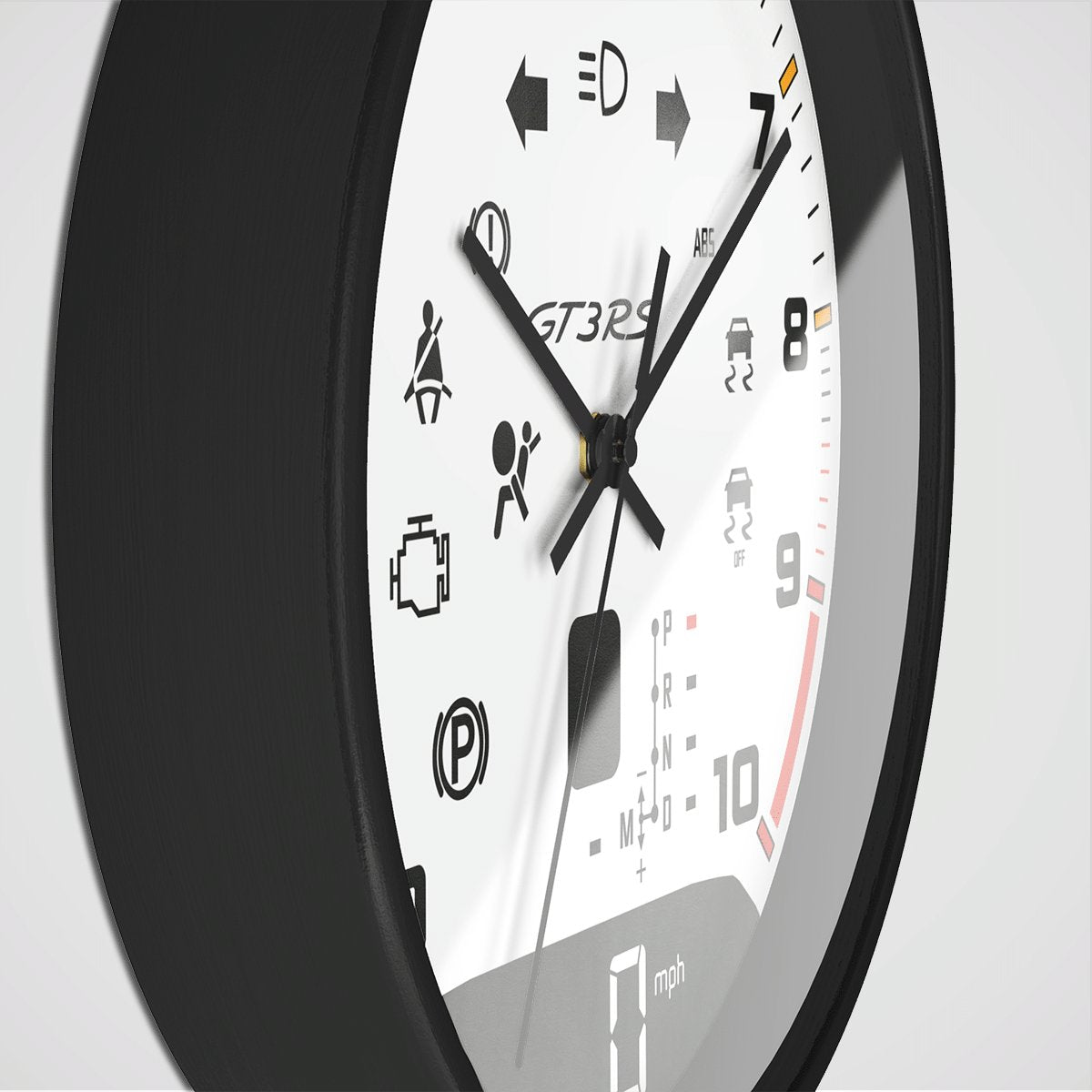 Bring a motorsport feel to your space with a wall clock inspired by classic speed-dial layouts. The dial artwork is printed on matte paper and mounted flat inside a lightweight modern frame with a clean, minimal finish.