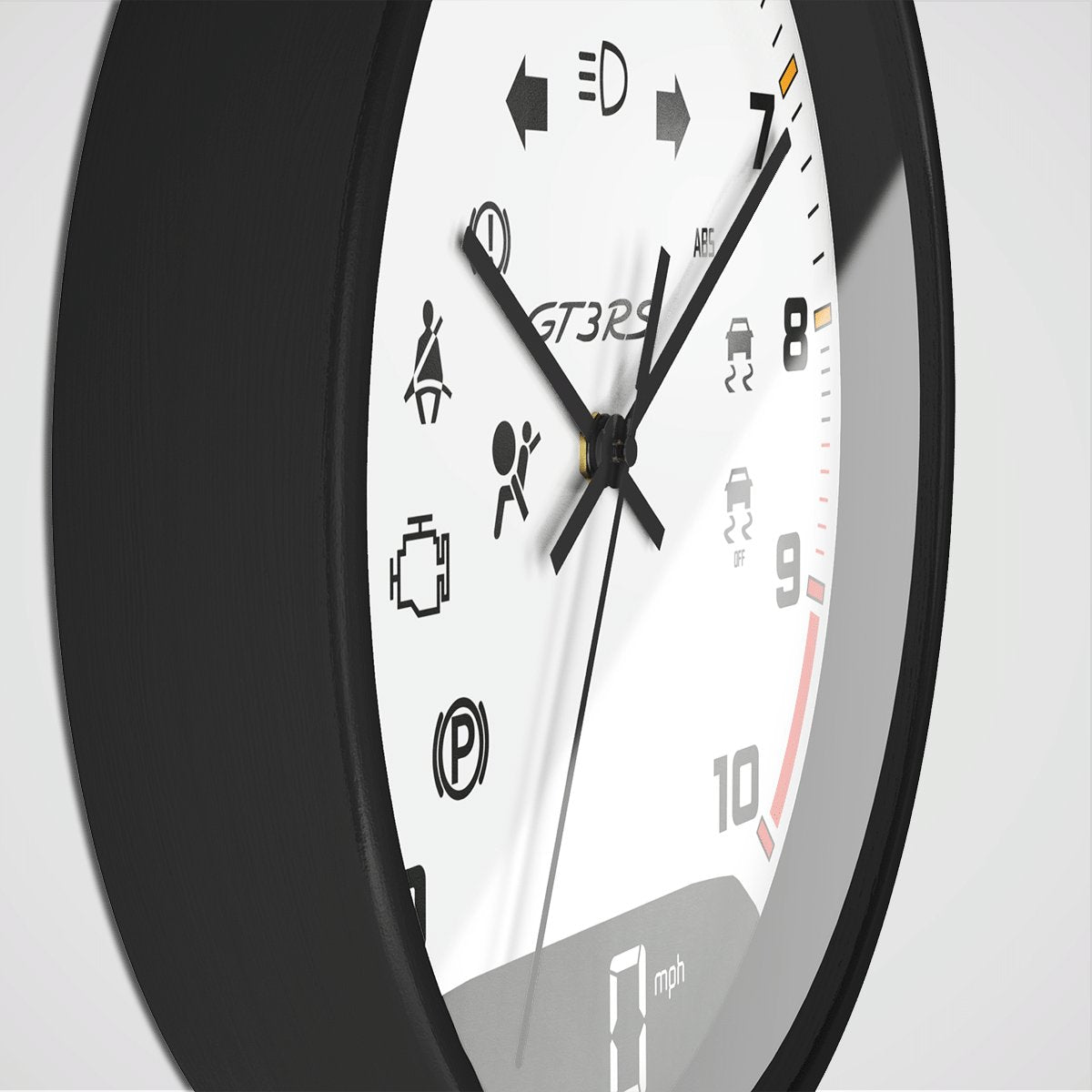 Bring a motorsport feel to your space with a wall clock inspired by classic speed-dial layouts. The dial artwork is printed on matte paper and mounted flat inside a lightweight modern frame with a clean, minimal finish.