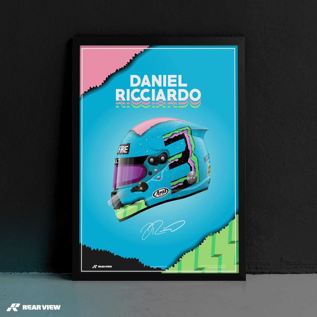 Featuring Daniel Ricciardo’s iconic helmet in electric blue with neon pink and green accents, this design nods to 90's flair while keeping its racing edge. The sharp detailing and punchy backdrop make it a standout piece for fans who appreciate both speed and style.